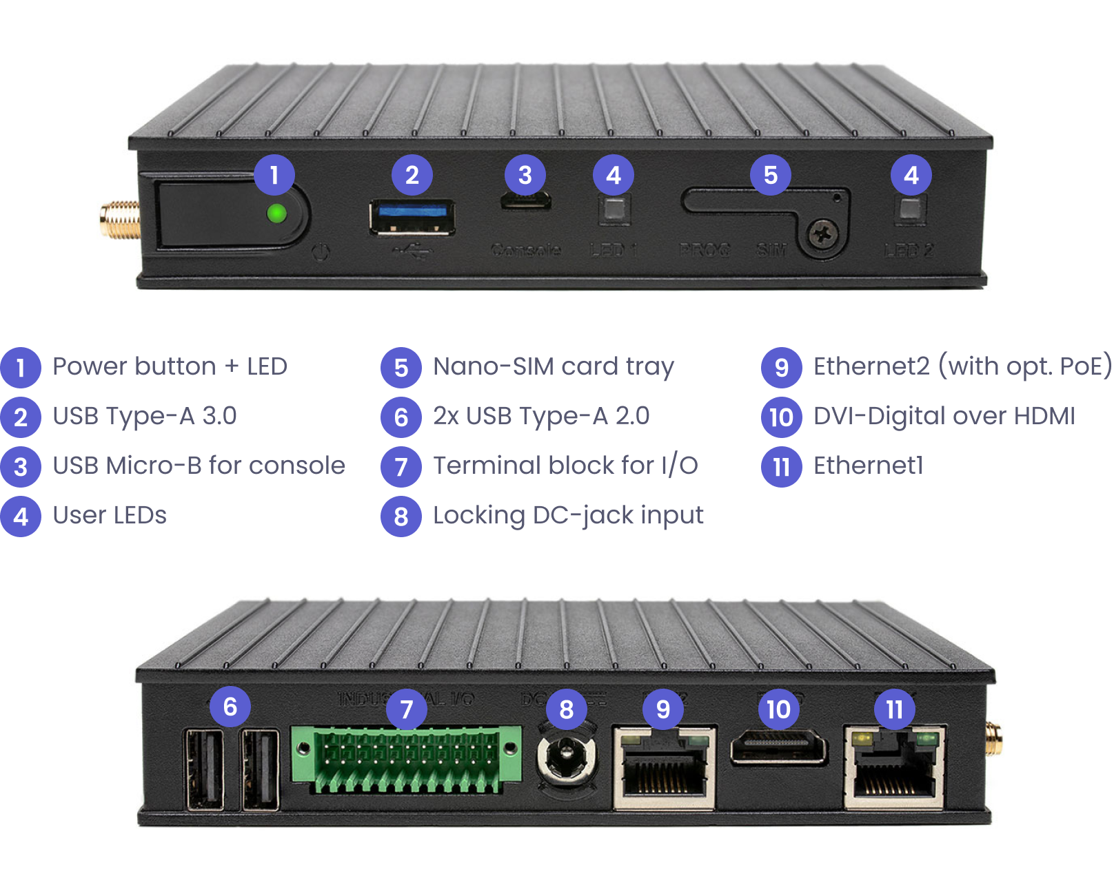 Power the device using the DC barrel jack or PoE (if supported). Turn the power plug clockwise to lock the plug if using the DC barrel jack. Make sure to use a 12/24/36 V power supply [1]. You should see the green power LED light up. If not, long-press and release the power button.